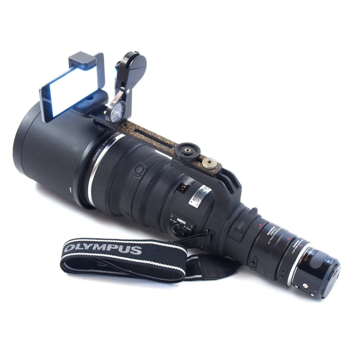Il sito Giapponese DC.Watch ha mostrato un interessante utilizzo dell’ultimo modulo Olympus Air, il modulo ottico di Olympus che consente di collegare una fotocamera e una lente formato Micro Quattro Terzi da controllare con uno smartphone. Il sito ha realizzato una sorta di “bazooka” fotografico, collegando alla Olympus Air un obiettivo ZUIKO DIGITAL ED 300mm F2.8 attraverso un adattatore; hanno poi costruito una specie di alloggiamento per inserire un iPhone, montando davanti anche una lente di ingrandimento per poter “mirare” con maggior precisione. Il supporto per iPhone e per la lente di ingrandimento è stato ricavato girando al contrario lo ZUIKO DIGITAL ED 300mm F2.8 e sfruttando così il supporto per il treppiede incluso nella lente.