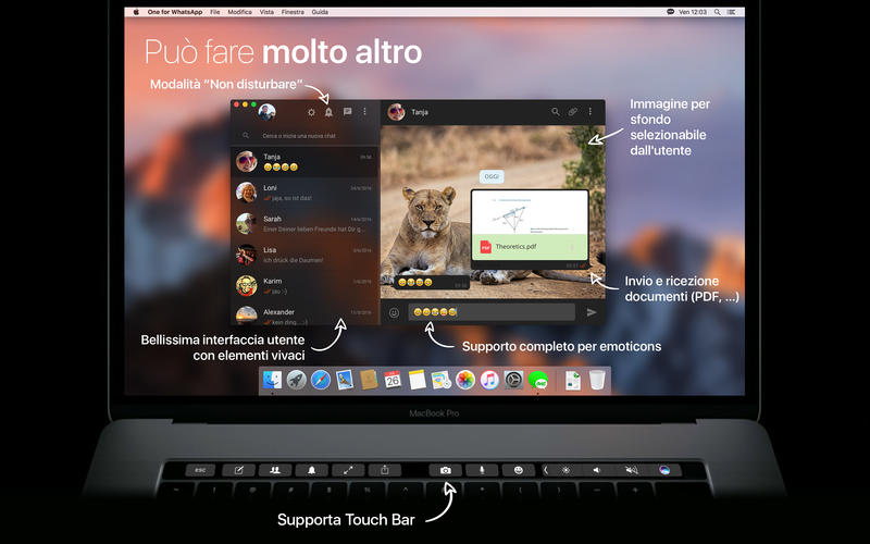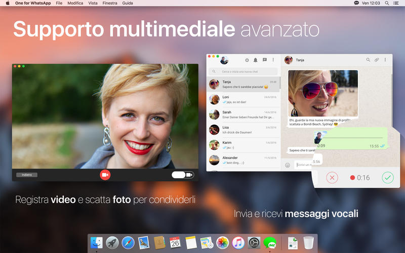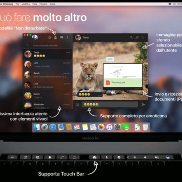 One for WhatsApp offre anche il supporto multimediale, potendo registrare video, o scattare foto, da inviare direttamente sulle chat. Non manca il supporto all’invio e alla ricezione dei messaggi vocali. Disponibile anche una modalità privacy, grazie alla quale l’app si blocca dopo l’intervallo di inattività selezionato. Per riavviare la sessione, oltre a poter inserire il proprio codice PIN, sarà possibile utilizzare la nuova Touch Bar degli ultimi Macbook Pro 2016.