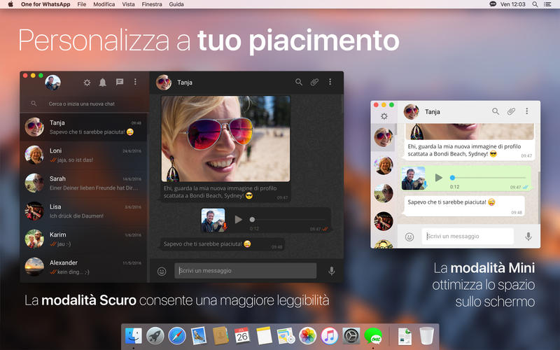One for WhatsApp include anche personalizzazioni a livello stilistico, potendo utilizzare temi bianchi o neri per una migliore lettura e una visibilità migliore, soprattutto nelle ore notturne. Inoltre, particolarmente utile potrebbe risultare la modalità Mini, che consente di ottimizzare spazio sulla Scrivania del proprio Mac, riducendo l’interfaccia generale dell’applicativo, ma consentendo comunque di chattare in tranquillità con i propri contatti.