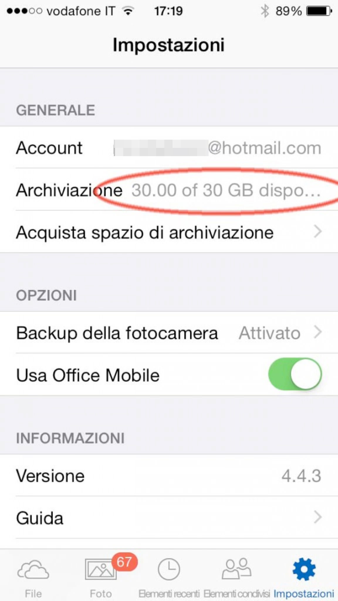 Da oggi fino alla fine del mese, infatti, basta scaricare l’app OneDrive per iOS (si scarica gratuitamente dall’App Store) e attivare l’opzione per il backup automatico della fotocamera (funzione che consente di eseguire il backup automatico di foto e video). Scegliendo questa opzione si hanno a disposizione, 15GB aggiuntivi portando lo spazio complessivo disponibile sul cloud a 30GB. Dopo l’attivazione della funzione, l’applicazione potrebbe erroneamente indicare di aver aggiunto altri 3GB; in realtà andando nelle impostazioni è possibile verificare che lo spazio complessivo disponibile ammonta a 30GB.