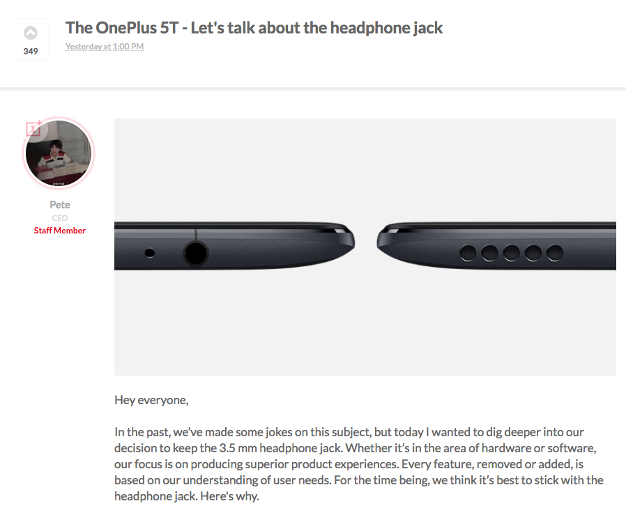 Pete Lau, CEO di OnePlus ha deciso di intervenire direttamente sul forum ufficiale del brand per prendere posizione e spiegare le ragioni che stanno alla base di questa lotta a favore del jack da 3.5mm, sostanzialmente riassumibili in due parole: qualità e libertà.