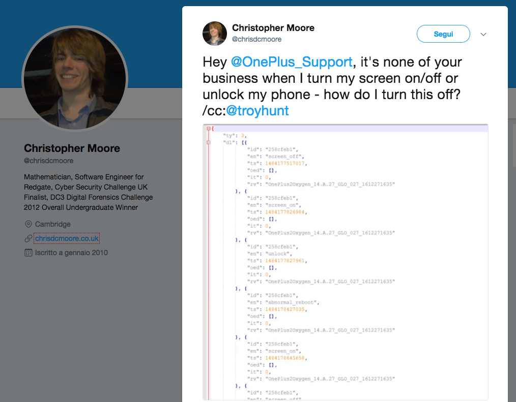 Moore mette in evidenza che è stato in grado di vedere i timestamp relativi a quando aveva aperto Slack e Microsoft Outlook, precisi al millisecondo, tutti stampati con il numero di serie del suo telefono che lo lega direttamente al dispositivo da quando l’aveva acquistato da OnePlus.