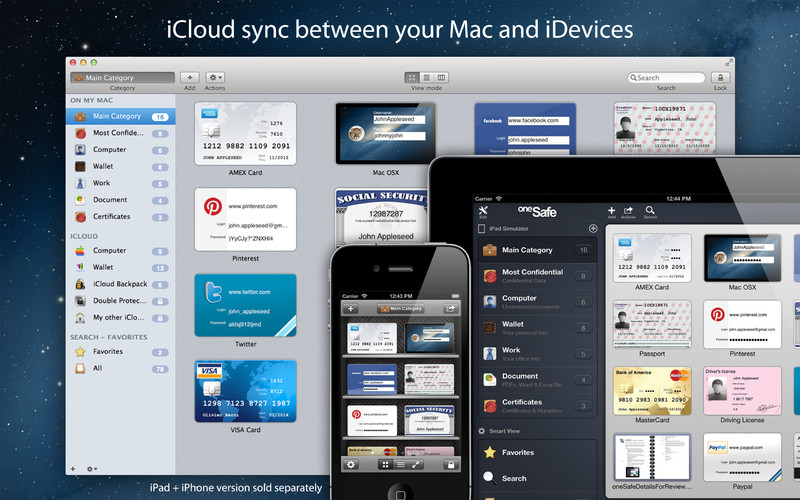 Tutti i dati inseriti in oneSafe sono protetti con crittografia AES a 256bit inoltre, grazie alla sincronizzazione tramite iCloud, tutti i dati aggiornati sono sempre disponibili e sincronizzati su Mac, iPhone e iPad per gli utenti che decidono di utilizzare entrambe le versioni dell’app.