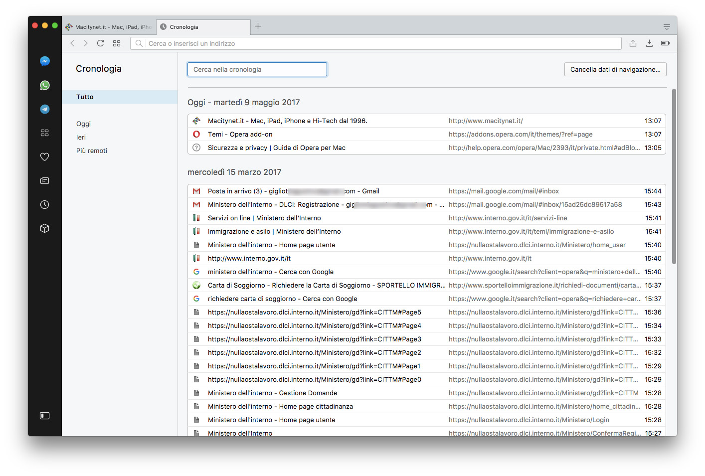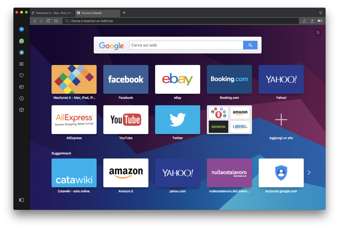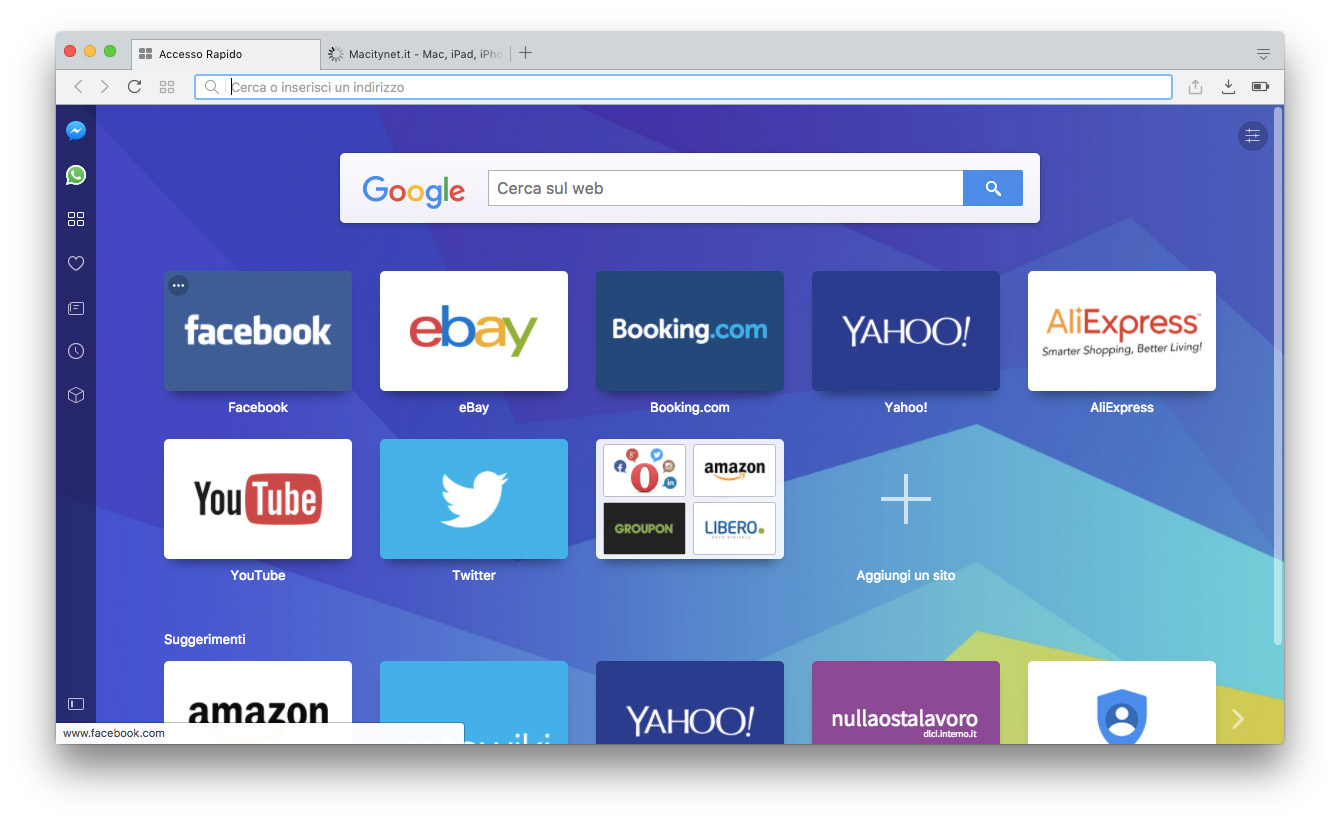 Il cambiamento più evidente è la presenza di una barra laterale dalla quale richiamare immediatamente segnalibri, le notizie personalizzate, la cronologia, le estensioni ma anche app di messaggistica come Messenger, WhatsApp e Telegram; quest’ultima è una funzionalità utile per chi lavora con questi sistemi, permettendo di comunicare con i propri contatti senza lasciare il browser. La prima volta che si seleziona uno di questi servizi si deve autorizzare l’accesso; il riquadro laterale può essere ancorato in modo permanente e sbloccato al volo premendo un piccolo pulsante in basso a sinistra. Selezionando la voce “Preferenze” del menu “Opera” è possibile scegliere la sezione “Di base” e da qui “Gestisci barra laterale” per personalizzare gli elementi che devono comparire.