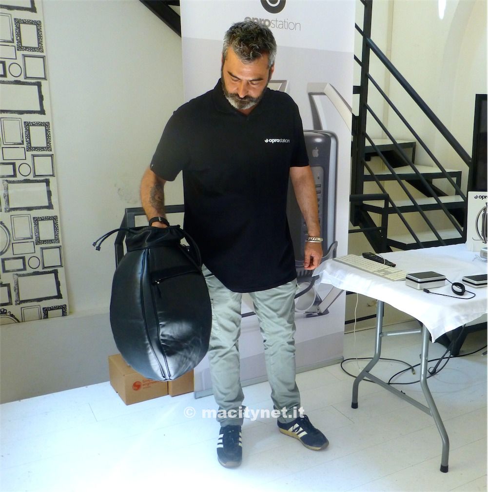 Nella parte finale della presentazione la parola è passata da Matteo Discardi a Umberto Carella, il designer che ha concepito e costruito Oprostation. Quando la struttura è chiusa e viene applicata la maniglia il Mac Pro può essere sollevato e trasportato in modo molto più sicuro e pratico: così Umberto Carella solleva il Mac Pro unito a Oprostation per riporre il tutto all’interno di una elegante borsa in pelle nera costruita su misura: l’aspetto ricorda vagamente quello di una borsa per le mazze da golf, solo più piccola e di forma diversa. Anche la borsa è stata studiata nei dettagli: dalla parte superiore fuoriesce solo la maniglia di Oprostation che è possibile afferrare per trasportare il Mac Pro fuori ufficio per lavorare in esterni o direttamente presso il cliente, in una stanza d’albergo od ovunque il professionista è chiamato a lavorare.