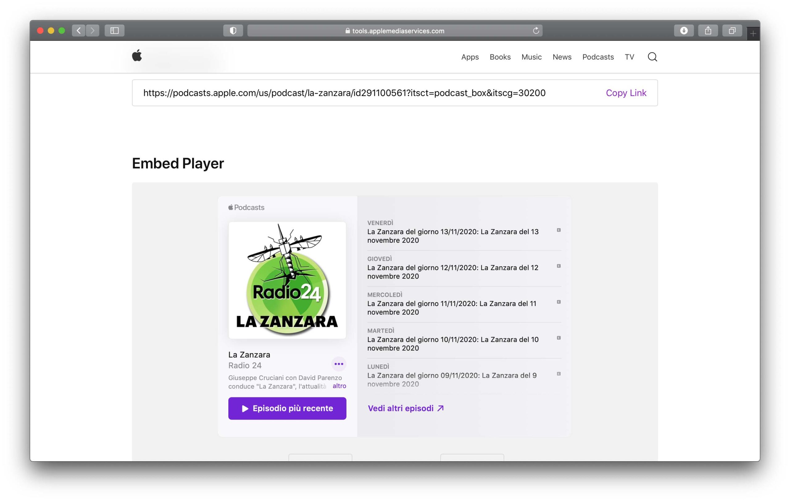 Da questo indirizzo è possibile ottenere il codice embed, badge, icona, codice QR, il player da incorporare. Il player permette di avviare la riproduzione del podcast direttamente nelle pagine HTML dal sito nel quale viene incollato il codice, con opzioni per aprire il podcast da iOS, iPadOS e macOS.