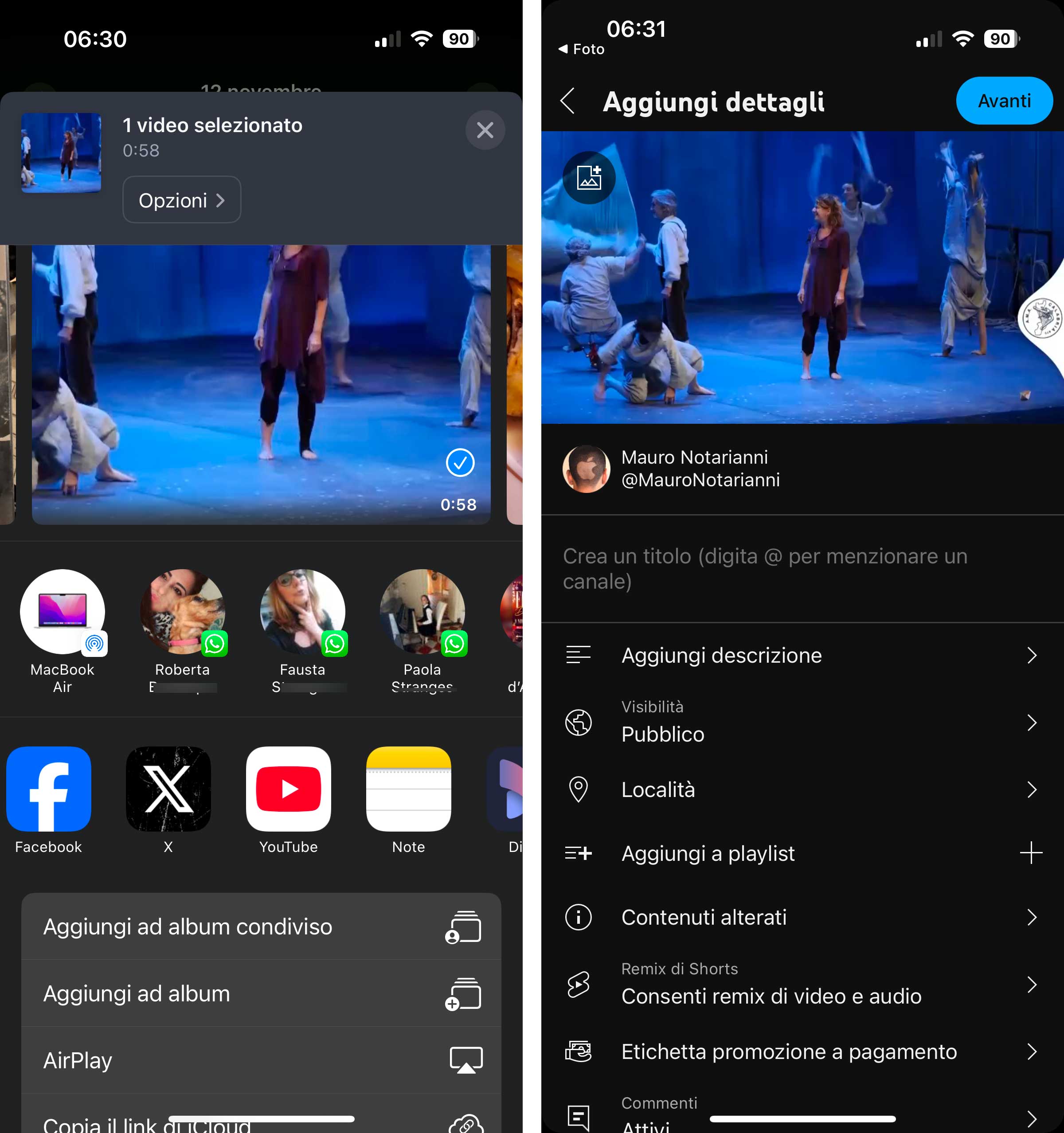 La possibilità di condividere video è comoda per caricare short o video al volo, indicando titolo, descrizione, visibilità e altre opzioni.