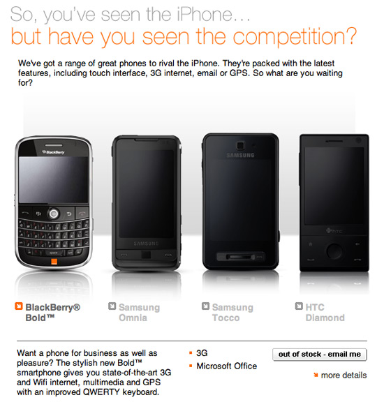 Nel momento in cui scriviamo Blackberry Bold è segnalato come esaurito nello shop online di Orange: qui riproduciamo una immagine della pagina Web.