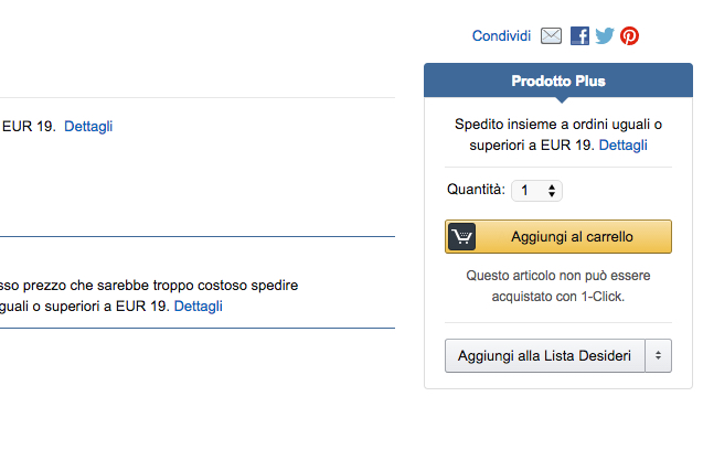 Inoltre la maggior parte dei prodotti rientrano nella categoria Prodotto Plus, ovvero prodotti che possono essere spediti solo a fronte di una spesa dall’importo complessivo non inferiore ai 19 euro.