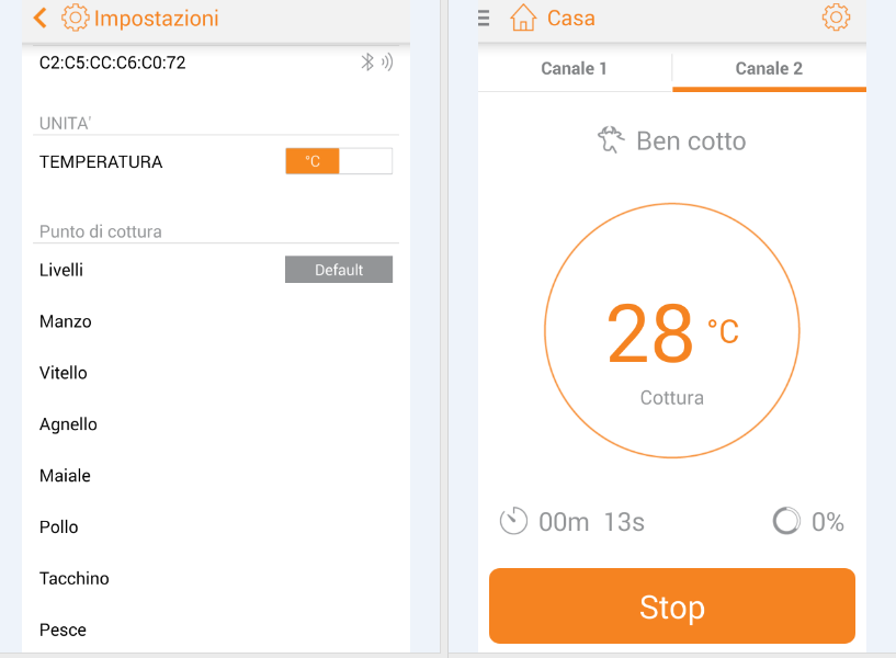 La schermata principale dell’applicazione, che prende il nome di Grill right e si scarica gratis da qui, come anticipato in precedenza, è molto intuitiva e facilita di gran lunga il funzionamento del termometro. In alto è possibile selezionare il canale 1 o 2, a seconda di dove sia stata inserita la sonda inclusa nella confezione, mentre grazie all’icona a forma di matita è possibile selezionare uno dei tre metodi di cottura tra carne, temperatura e timer. Quest’ultimo permette di impostare direttamente i minuti e secondi di cottura desiderati, senza l’obbligo di selezionare il tipo di carne o la temperatura desiderata, mentre con l’opzione temperatura si sceglierà di cuocere la carne a seconda della temperatura interna rilevata dalla sonda, potendo essere informati sul livello di cottura tra ben cotta, cottura media, media al sangue o completamente al sangue. La terza modalità di cottura selezionabile, Carne, è quella che risulta più divertente e particolare. Grazie a questa funzione sarà possibile scegliere la tipologia di carne da cuocere tra manzo, vitello, agnello, maiale, pollo, tacchino, pesce, hamburger, così da lasciare lavorare il termometro e l’applicazione con i parametri predefiniti, in modo da dover premere solo il pulsante avvia per essere informati del grado di cottura del cibo. Per ciascuna tipologia di carne è anche possibile modificare i parametri di default e selezionare una diversa temperatura da associare ai diversi stadi di cottura.