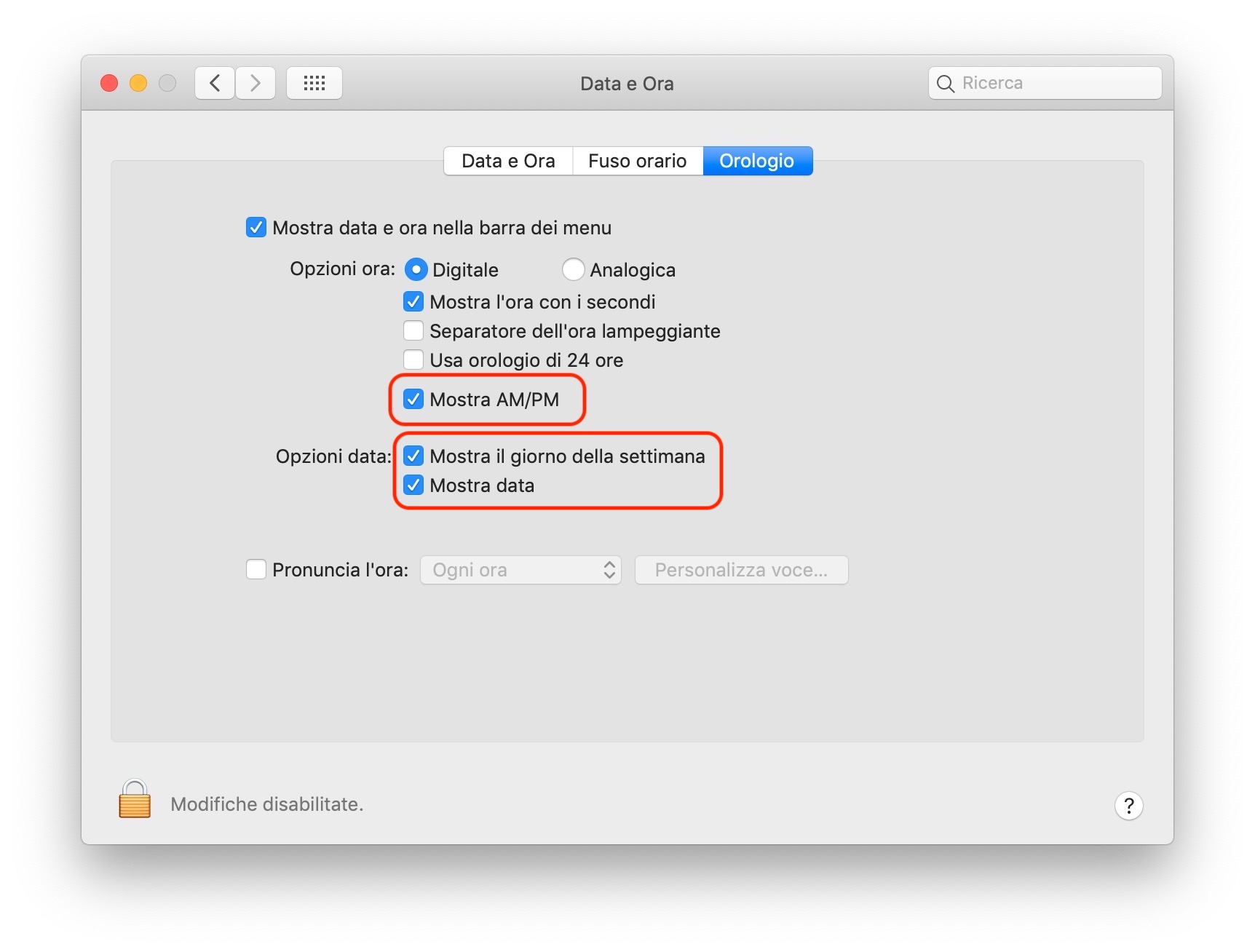 Per visualizzare giorno e mese correnti insieme al giorno della settimana è sufficiente abilitare le relative funzioni disponibili all’interno del menù “Preferenze di Sistema > Data e Ora” e selezionare poi la scheda “Orologio” (sulle versioni più recenti di macOS aprite Preferenze di Sistema > Dock e barra dei menu, sezione “Orologio”): a questo punto, attivate la spunta sulle opzioni “Mostra il giorno della settimana” e “Mostra data”.
