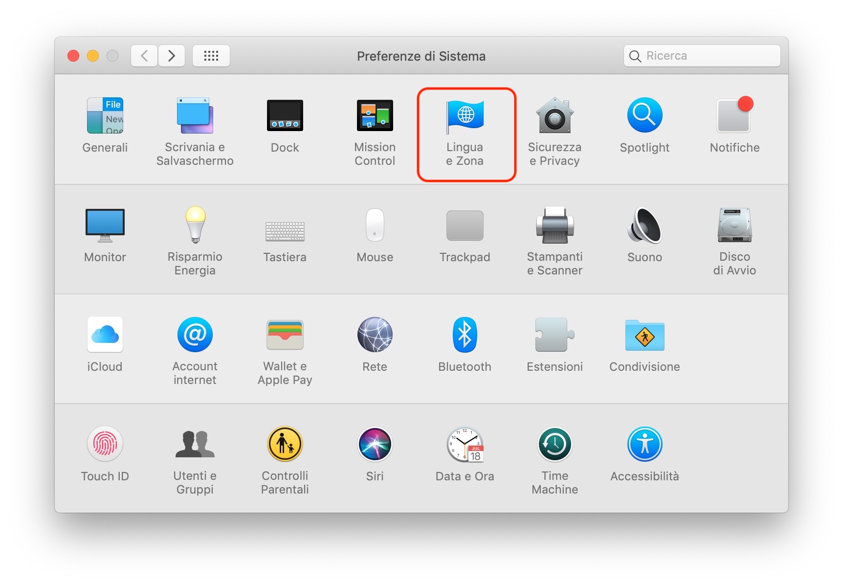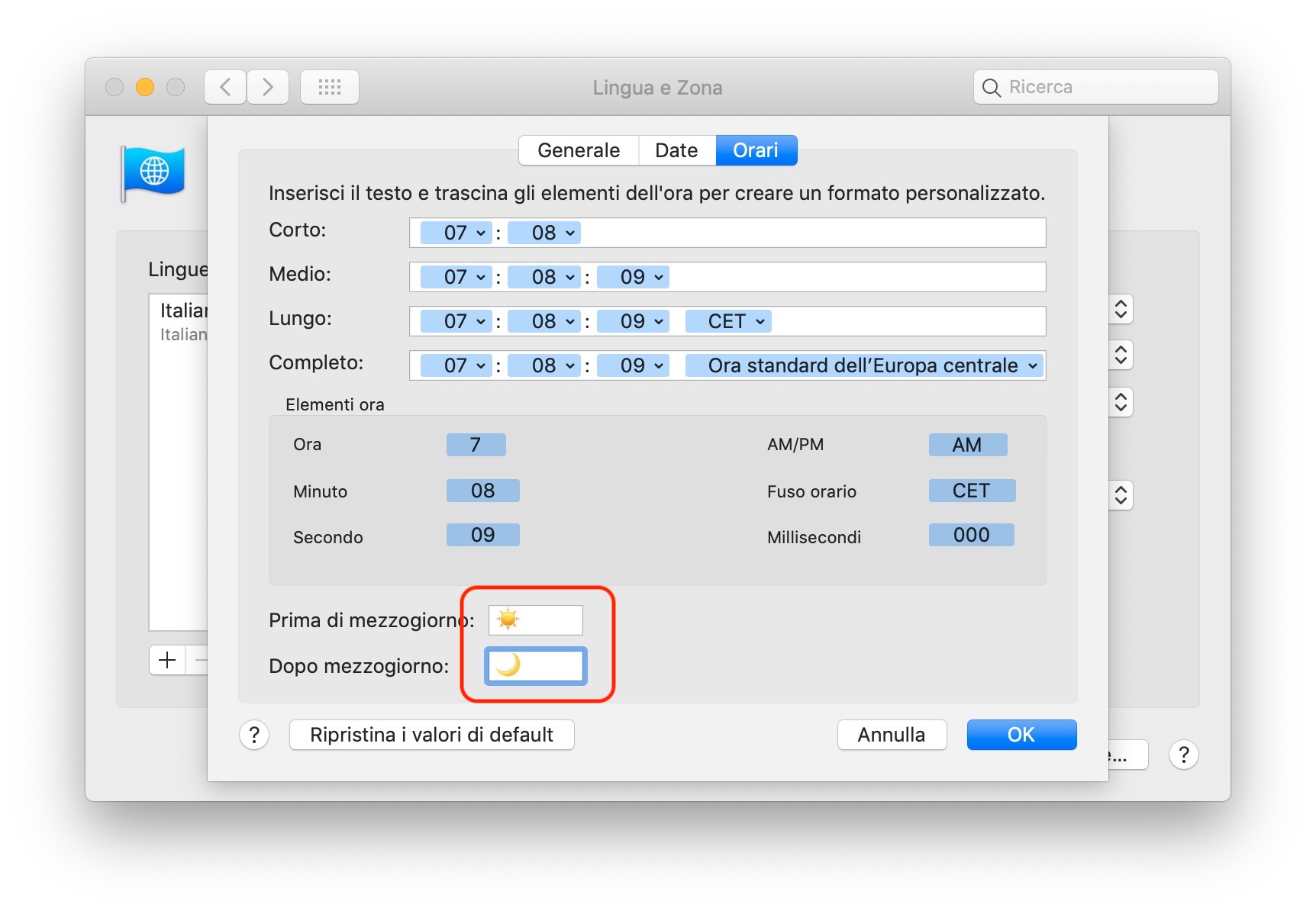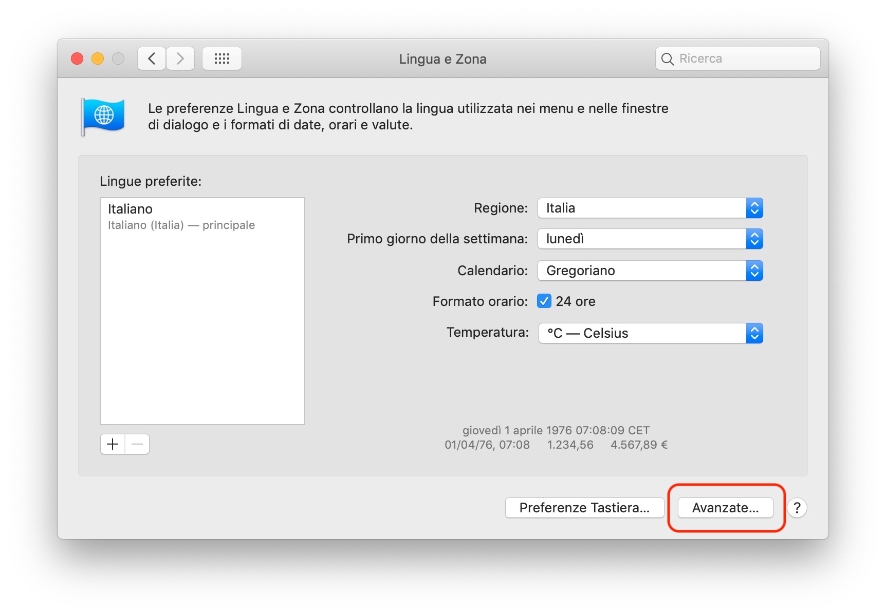 A questo punto, tornate indietro e sempre all’interno delle “Preferenze di Sistema” selezionate “Lingua e Zona”, cliccate su “Avanzate” e selezionate la scheda “Orari”.