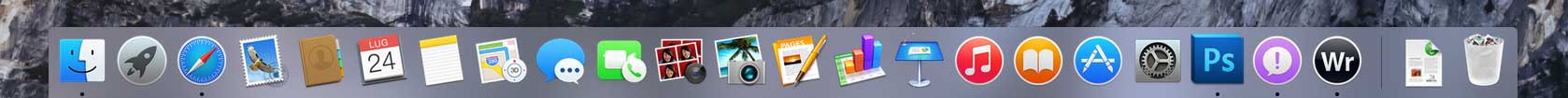 Il nuovo Dock segue lo stile della nuova interfaccia, ora con trasparenze nelle finestre e barre degli strumenti stilizzate. Con OS X Yosemite, Apple ha lavorato sull’aspetto del Dock e delle sue icone scegliendo un design pulito e uniforme. Le icone delle applicazioni hanno un look più armonico, pur rimanendo tutte immediatamente riconoscibili.