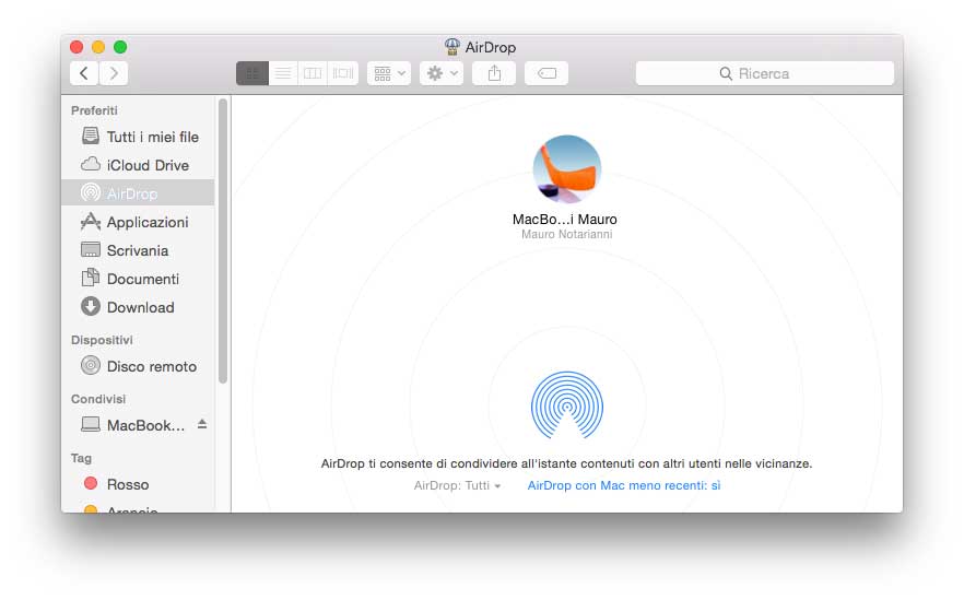 AirDrop. Sfruttando AirDrop è possibile trasferire file da un Mac all’altro. Il sistema ora funziona anche fra Mac e iOS: si seleziona un file in una qualsiasi cartella, poi usi AirDrop per mandarlo a un altro Mac o a un dispositivo iOS nelle vicinanze. È il modo più veloce per far avere un file a un collega nell’ufficio accanto, o per passare una presentazione al cliente seduto di fronte a noi.