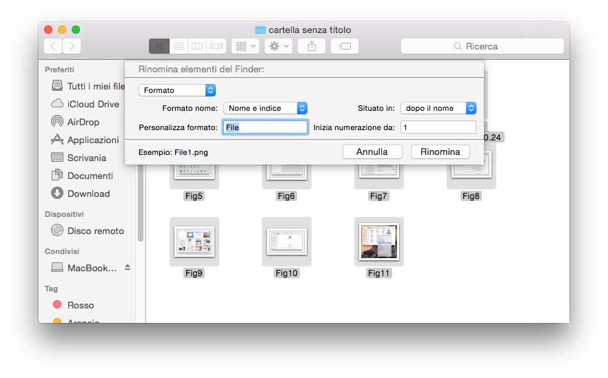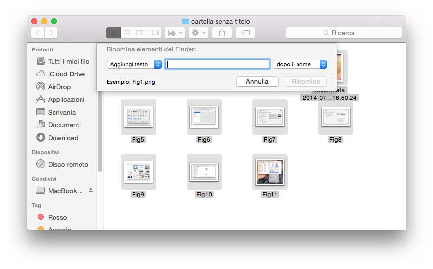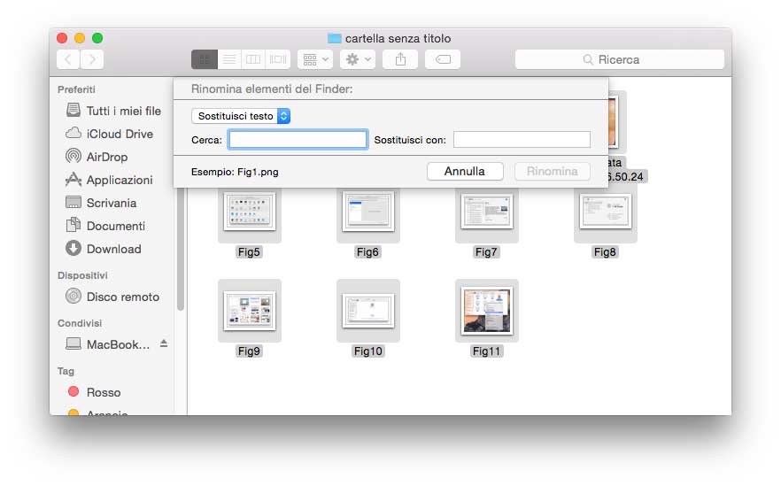 Rinominare gruppi di file. È possibile rinominare gruppi di file (in precedenza si poteva fare con Automator, AppleScript o utility specifiche); selezionando un gruppo di documenti con il tasto destro del mouse/trackpad appare ora nel menu contestuale la voce “Rinomina elementi” con la quale, come si può intuire, è possibile di cambiare il nome a più file contemporaneamente. È possibile sostituire un testo specifico nel gruppo, aggiungerlo, cambiare formato.