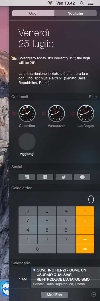 Notifiche. La funzione “Oggi” nel Centro Notifiche offre un breve riepilogo degli eventi, i promemoria e i compleanni del giorno, e un riassunto di quello che ci aspetta domani. È possibile include i widget Calendario, Meteo, Borsa, Calcolatrice, Orologio e Promemoria. Sul Mac App Store saranno disponibili altri widget per personalizzare la vista.
