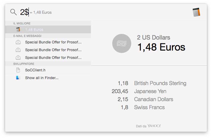 Conversioni. È possibile usare SpotLight per convertire le valute: basta indicare ad esempio il prezzo in $ per ottenere al volo la conversione in euro aggiornata in tempo reale. Da dollari ed euro, piedi e metri, libbre e chili, ettari e acri: Spotlight conosce valuta e unità di misura e sa convertirle al volo.