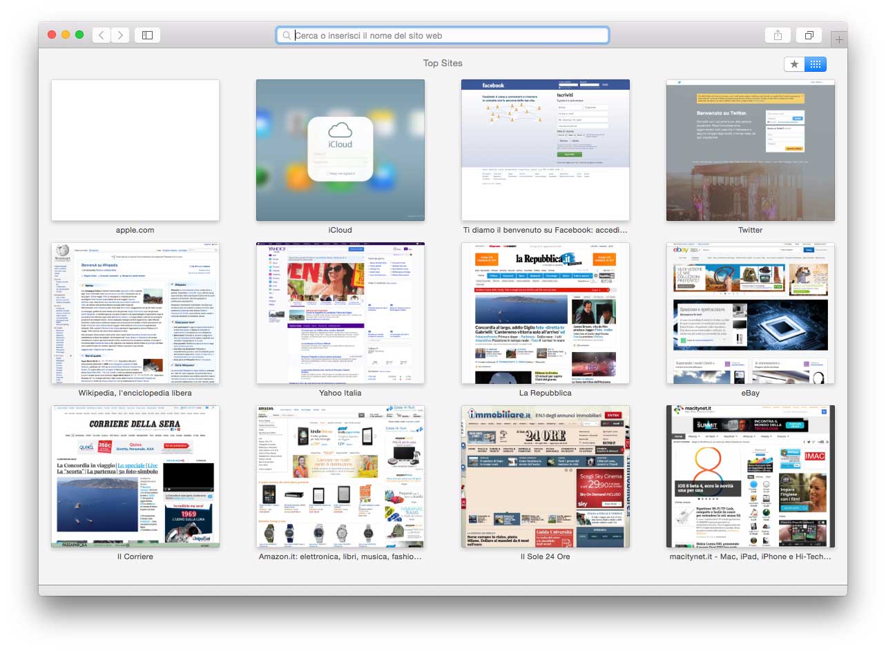 La nuova vista Preferiti in Safari: un clic nel campo di ricerca “intelligente” apre una griglia con le icone dei siti che amiamo di più. Basta cliccare per selezionare.