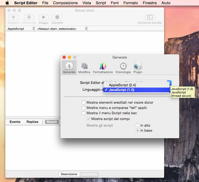 Apple non abbandona AppleScript e continua a supportare tale tecnologia, potentissima e spesso sottovalutata. Gli script continueranno a funzionare più o meno come sempre (nella beta del sistema operativo vi sono dei bug da sistemare che dovrebbero essere risolti nella release definitiva) ma la novità più interessante è la possibilità di scrivere con l’editor dedicato non solo in AppleScript ma anche JavaScript. Nella sezione “Linguaggio di default” delle Preferenze potremmo scegliere sia AppleScript, sia JavaScript.