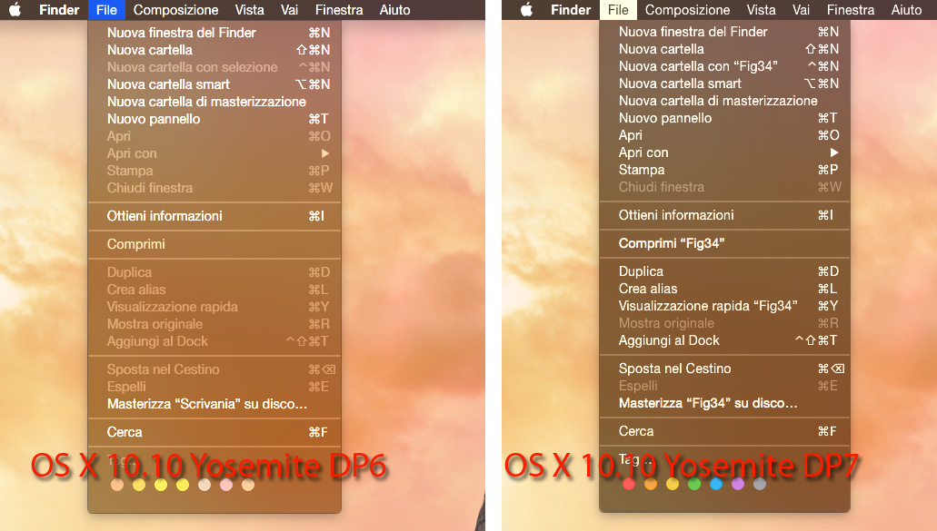 Nell’ultima build di OS X 10.10 Yosemite (Developer Preview 7) Apple ha migliorato la visualizzazione del font di sistema (Helvetica Neue) usato nel menu de Finder. La differenza rispetto a prima si nota sia con gli schermi Retina. sia con quelli non Retina: i caratteri sono più leggibili e le lettere si distinguono meglio, in particolare quando si osserva lo schermo da vicino. Tecnicamente Apple ha disabilitato per la barra dei menu l’antialiasing, l’effetto che ammorbidisce l’effetto di rendering tramite l’uso dei subpixel (una tecnica che “leviga” i caratteri applicando ai bordi dei subpixel).