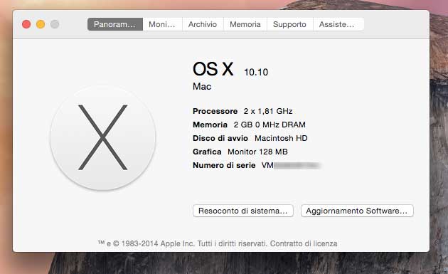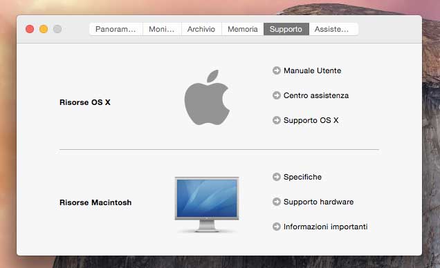 Le finestre “Informazioni su questo Mac” e quella di “Resoconto di Sistema” sono state in qualche modo riunite nel futuro OS X 10.10 Yosemite. Selezionando nel futuro sistema, la voce “Informazioni su questo Mac” non appare più la finestra con le informazioni essenziali quali: versione del sistema operativo, tipo processore e memoria ma informazioni dettagliate su display, unità di storage, memoria, risorse di supporto e assistenza da una finestra dalla quale sono selezionabili i vari pannelli. Dalla sezione “monitor” è possibile richiamare le Preferenze del display, da quella “Memoria” richiamare istruzioni sull’aggiornamento della RAM, da “Archivio” richiamare “Utility disco”.