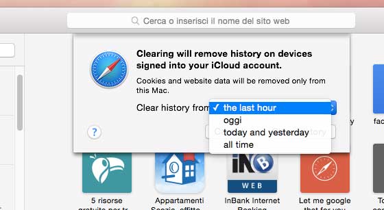 Il menu “Cronologia” permette di cancellare la cronologia quotidiana, mentre una voce specifica permette di cancellare le pagine viste nell’ultima ora, oggi, oggi e ieri o tutto.