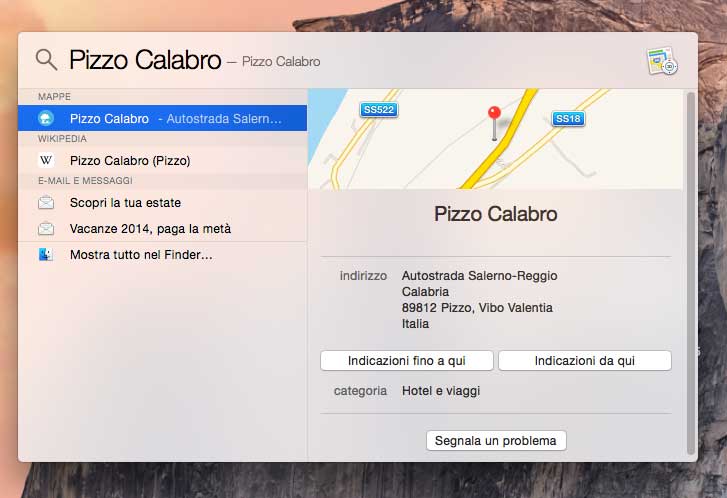 In OS X 10.10 Yosemite l’icona a forma di lente di ingrandimento di Spotlight è ancora nell’angolo superiore destro dello schermo ma quando si fa click, oppure nel Finder si preme CTRL-spazio sulla tastiera, ecco il primo cambiamento rispetto a OS X 10.9 Mavericks e precedenti: viene proposta una finestra di ricerca in sovraimpressione quasi al centro dello schermo dove digitare le ricerche e visualizzare quanto trovato.