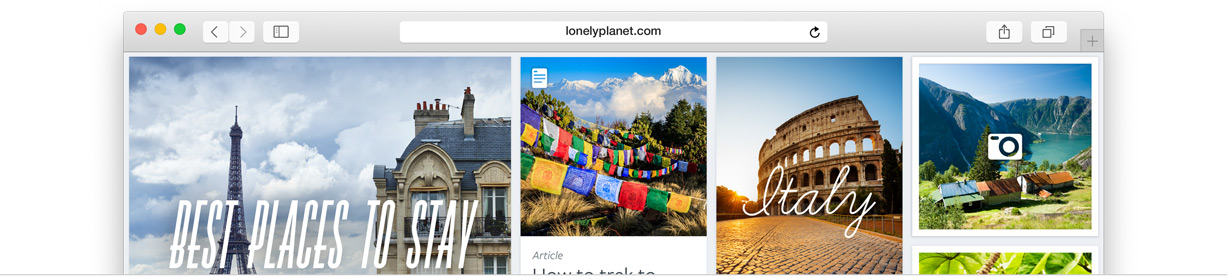 Safari ha un nuovo design semplificato. Una nuova vista Preferiti consente di accedere rapidamente ai siti web preferiti, e una nuova interessante vista Tab mostra le miniature di tutte le pagine web aperte in un’unica finestra. La nuova versione del browser offre anche un maggiore controllo sulla privacy, con finestre separate di Navigazione Privata e il supporto integrato per DuckDuckGo, un motore di ricerca che non traccia gli utenti. Quando cerchiamo termini popolari o comuni, appaiono i nuovi Suggerimenti Spotlight insieme ai suggerimenti dal provider di ricerca predefinito. Safari mostra suggerimenti prendendoli da fonti come Wikipedia, Bing, Mappe, notizie e iTunes, oltre a quelli forniti dal motore di ricerca impostato dall’utente. Il browser di Apple supporta i più recenti standard web, compresi WebGL, SPDY, anche HTML5 Premium Video Extension. Alimentato dal motore Nitro JavaScript, Safari è secondo Apple fino a sei volte più veloce di Firefox e oltre cinque volte più veloce di Chrome quando esegue JavaScript.