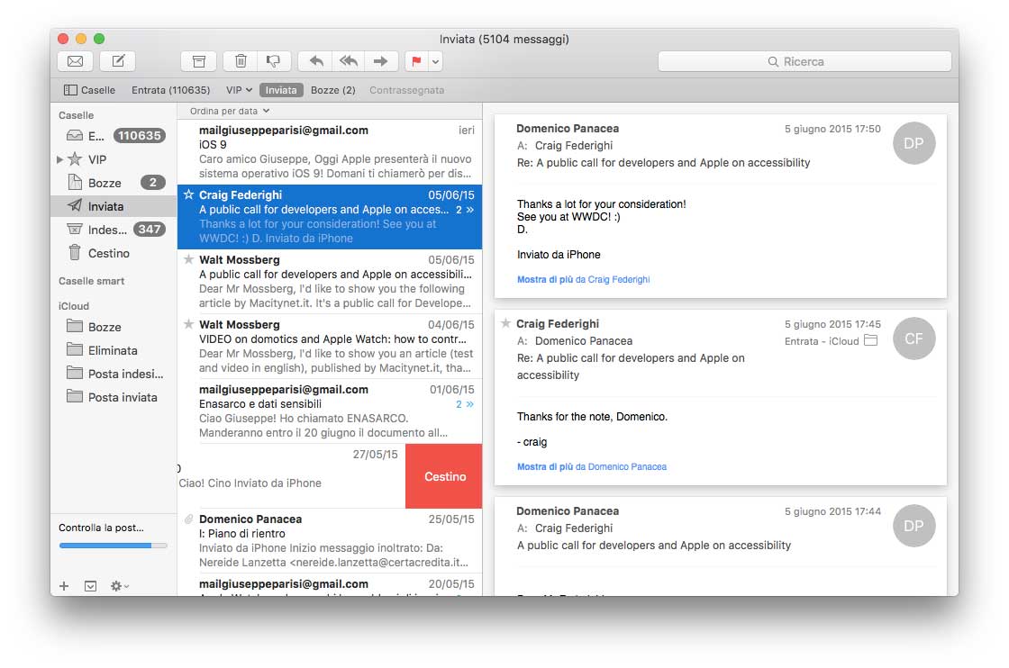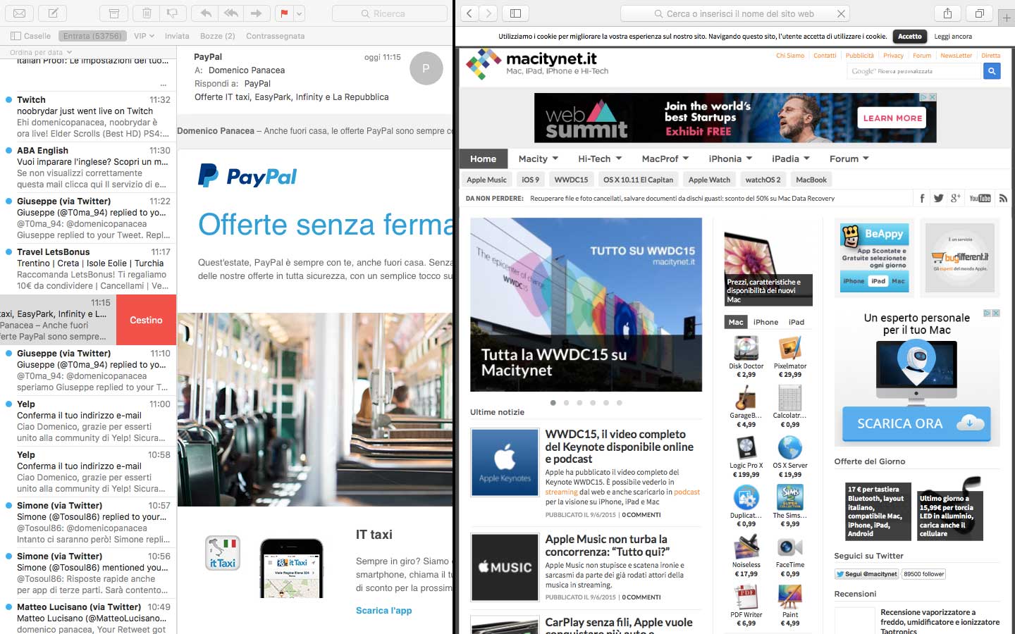 OS X 10.11 El Capitan mette a disposizione un modo più veloce di vedere tutte le finestre aperte, rendendo più semplice trovare rapidamente la finestra di cui si ha bisogno. Quando la Scrivania è affollata, basta trascinare una finestra nella parte superiore dello schermo per accedere alla nuova Spaces Bar in Mission Control e creare un nuovo Spazio (il meccanismo con il quale OS X raggruppa le applicazioni). La nuova funzione Split View posiziona in automatico le finestre di due app una accanto all’altra in modalità a schermo intero: l’utente può lavorare su entrambe senza distrazioni, con vantaggi anche per chi sviluppa app. Sarà più semplice, ad esempio, affiancare due applicazioni e passare dati da una parte all’altra, anche con il drag&drop.