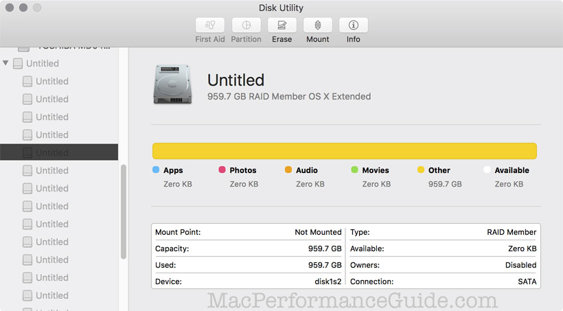 La possibilità di creare un set RAID duplicato, con striping o un set di dischi concatenati, non è del tutto scomparsa in OS X 10.11 ma bisogna fare affidamento al comando diskutil appleRAID del Terminale, meno semplice rispetto a quanto era possibile fare in precedenza e potenzialmente pericoloso, soprattutto quando si ha a che fare con molti dischi.