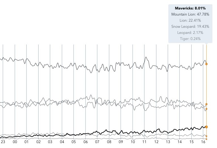 Mavericks è nel momento in cui scriviamo usato dall’9.27% di utenti che sfruttano il Mac per collegarsi. Il giovane Mavericks ha dunque superato OS X 10.5 Leopard e si appresta a superare l’inossidabile OS X 10.6 Snow Leopard.