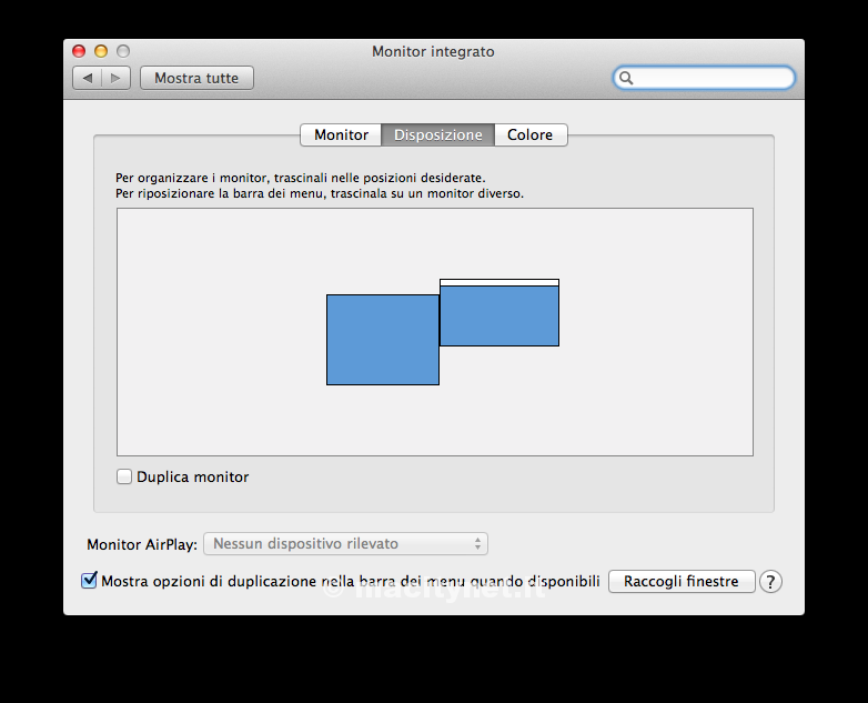 Il dock può essere visualizzato sul monitor primario o secondario e il Finder visualizza un menu indipendente anche sul secondo monitor. In questo momento stiamo scrivendo un testo sullo schermo del MacBook Air e sul monitor a destra vediamo una finestra di Safari con il menu del Finder visualizzato in alto. Se cominciamo a lavorare con il Finder nel monitor primario, il dock appare su questo; se cominciamo a lavorare nel Finder con il monitor secondario (es. apriamo una nuova finestra) il dock compare in quest’ultimo. È finalmente possibile mettere a tutto schermo le applicazioni sia sul monitor primario, sia su quello secondario e anche contemporaneamente ed è finalmente possibile gestire in modo autonomo ed efficace gli schermi.