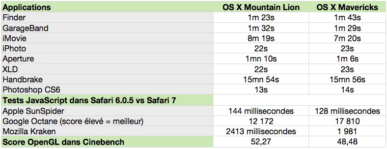 Alcune operazioni eseguite con iMovie su Mavericks sono il 12% più veloci, mentre la creazione di un file ZIP dal Finder (compressione di una cartella di 1.5GB) è più lenta del 24%. In alcuni casi (GarageBand e Aperture, ad esempio) sono stati ottenuti punteggi migliori con Mavericks; in altri (Photoshop, Handbrake, XLD e iPhoto) sono stati ottenuti risultati lievemente migliori con Mountain Lion (nel caso di Photoshop parliamo, ad esempio, di un secondo di differenza; con Handbrake di due secondi). In tutte i casi si tratta di dati irrilevanti, differenze poco significative che non avranno alcun impatto nell’uso quotidiano.