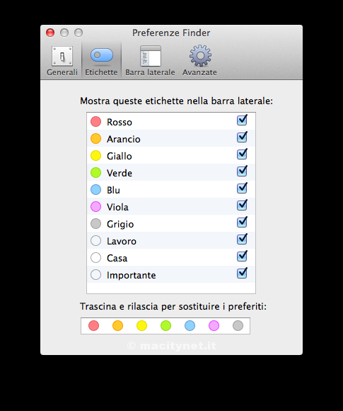 Si può facilmente taggare qualsiasi file nel Finder, in iCloud o quando si salva un nuovo documento. I Tag appaiono nella barra laterale del Finder così è facile visualizzare i file per progetto o categoria. Dalle Preferenze del Finder è possibile selezionare quali etichette mostrare nella barra laterale, cambiare i sette nomi di default (rosso, arancio, giallo, ecc.) e trascinare e rilasciare per sostituire i preferiti.