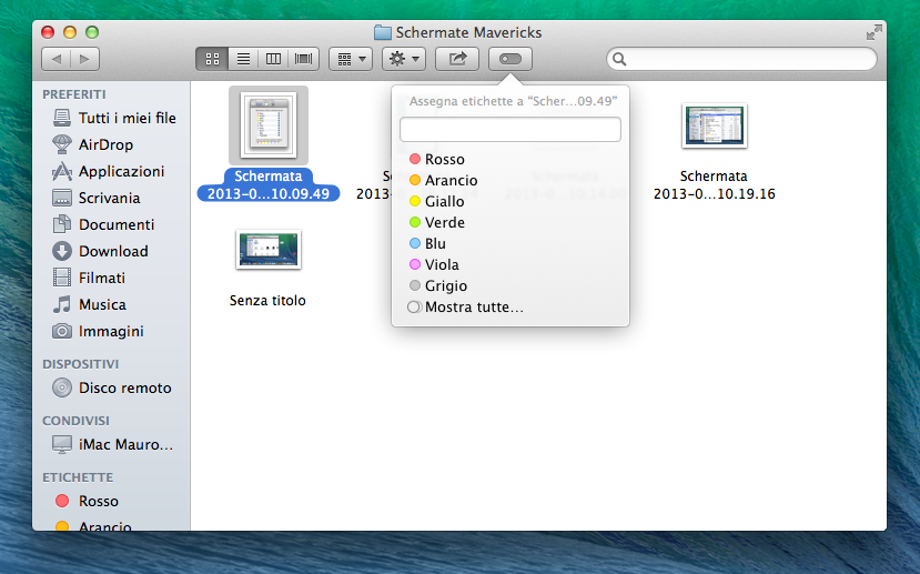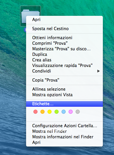 Per “taggare” un elemento basta selezionarlo con il tasto destro del mouse (o funzione equivalente) e scegliere l’etichetta desiderata. In alternativa è anche possibile utilizzare una nuova icona dedicata che compare nella barra degli strumenti di tutte le finestre del Finder. Da questa nuova icona è anche possibile creare direttamente dei tag, senza passare per le Preferenze.