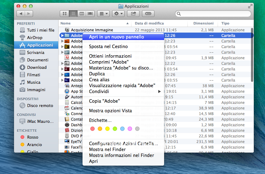Apple ha anche previsto la possibilità di selezionare una cartella e aprirla come un pannello del Finder (basta selezionarla tenendo premuto il tasto CMD e scegliere la voce “Apri in un nuovo pannello”). Sono presenti anche scorciatoie di tastiera per passare da un pannello all’altro senza toccare il mouse (CTRL+TAB o CTRL-Maiusc-TAB). È anche possibile “sganciare” un pannello e trasformarlo in finestra indipendente (basta trascinarlo con il mouse e portarlo fuori).