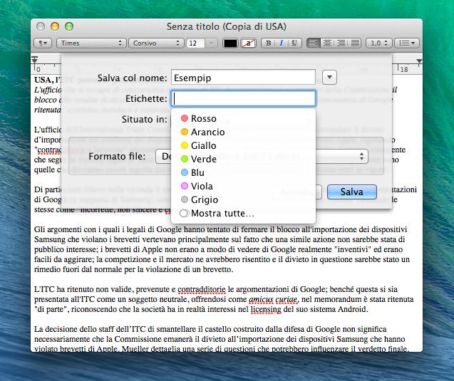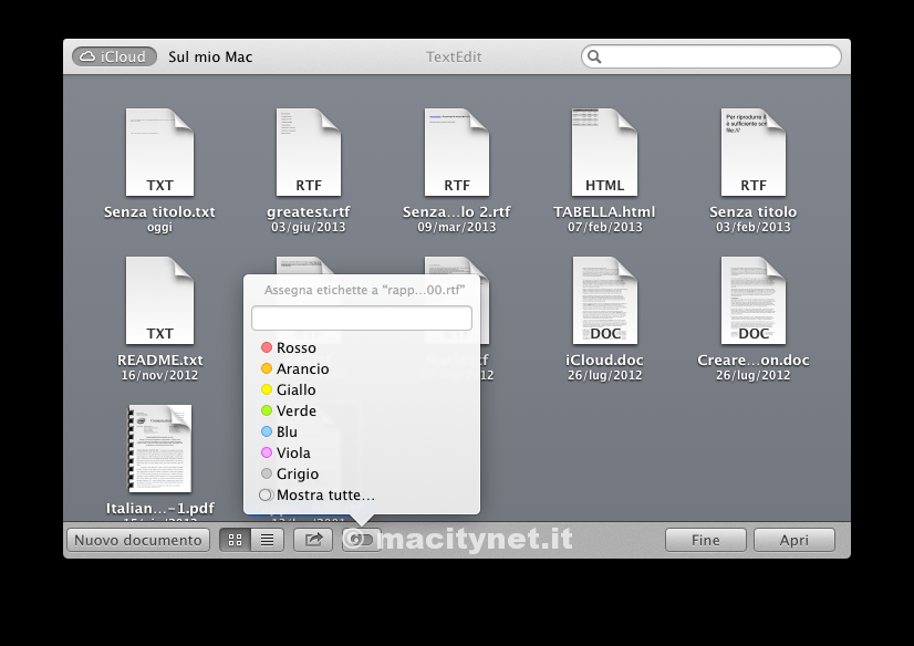 Molto interessante è l’integrazione dei tag nelle applicazioni. Quando salviamo un documento da un’applicazione (es. TextEdit) da una sezione dedicata (“Etichette”), è possibile selezionare le etichette desiderate. Da notare che una piccola modifica grafica è stata apportata anche alle etichette dei tag: pallini di piccole dimensioni anziché gli elementi eccessivamente vistosi che apparivano nelle precedenti versioni del sistema. Anche la finestra che mostra i documenti memorizzati su iCloud, integra ora un pulsante dedicato che consente di selezionare l’etichetta desiderata. Anche in questo caso, Apple ha preferito uno sfondo più discreto (un semplice grigio), anziché la trama che appare in OS X 10.8.x Mountain Lion.