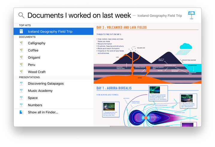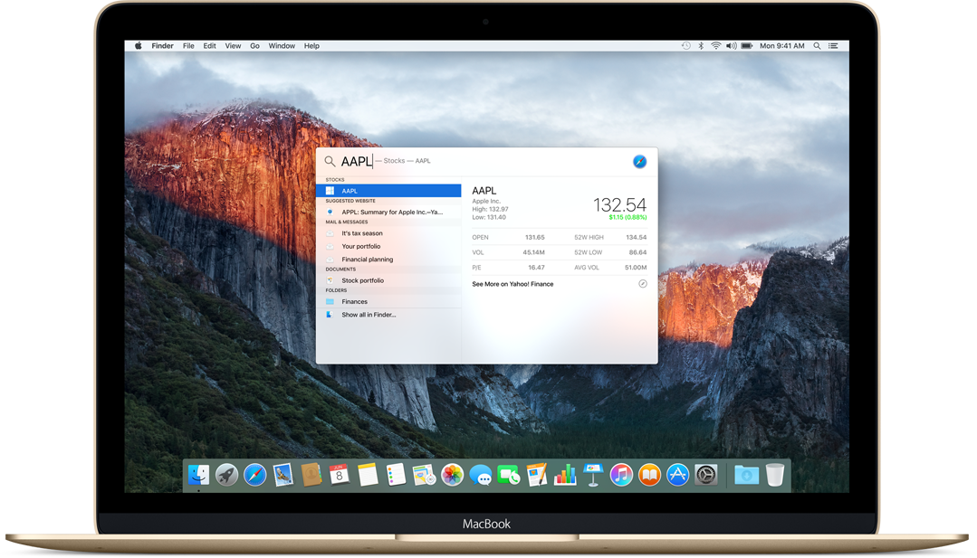Spotlight diventa più “smart” permettendo di accedere a più risultati, incluse previsioni del tempo, borsa, risultati sportivi, tragitti dei Mezzi Pubblici e filmati sul web. La finestra di Spotlight può essere spostata e ridimensionata per visualizzare un numero maggiore di risultati ed è anche possibile usare il linguaggio naturale per fare le ricerche (es. “Troviami tutte le mail di Mauro alle quali non ho risposto”).