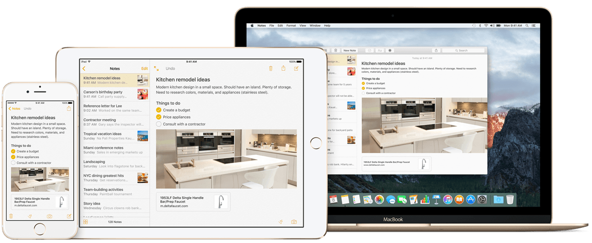 Note è stata riscritta e ora permette il drag&drop di foto, PDF, filmati e altri file nelle note, così come il contenuto di app quali Safari e Mappe usando il pulsante di condivisione. È possibile creare checklist aggiungendo i “punti” con un singolo click (si possono deselezionare man mano che i compiti vengono completati), sfruttare un nuovo browser per gli allegati (un unico punto di riferimento per gli Attachments nelle note come foto, località sulle mappe, video, link web) e sincronizzare le note via iCloud (se, ad esempio, deselezioniamo un punto nella checklist sul Mac, in automatico questa verrà deselezionato anche su iPhone).