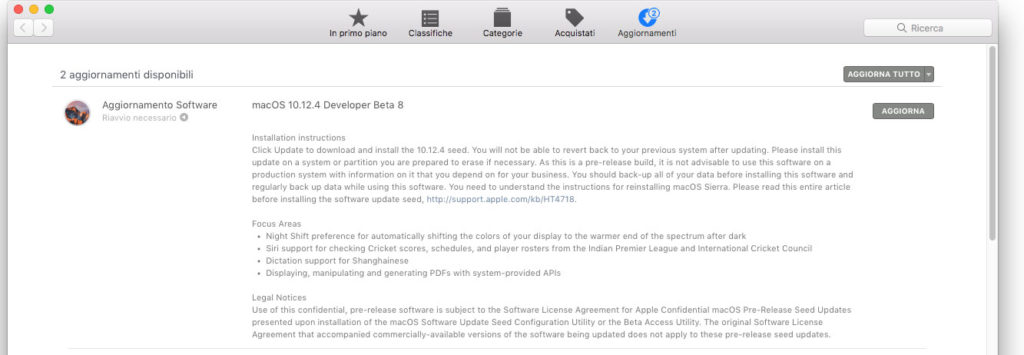 Home » Macity - Apple » AggiornaMac » Ottava beta di macOS 10.12.4 a sviluppatori e beta tester