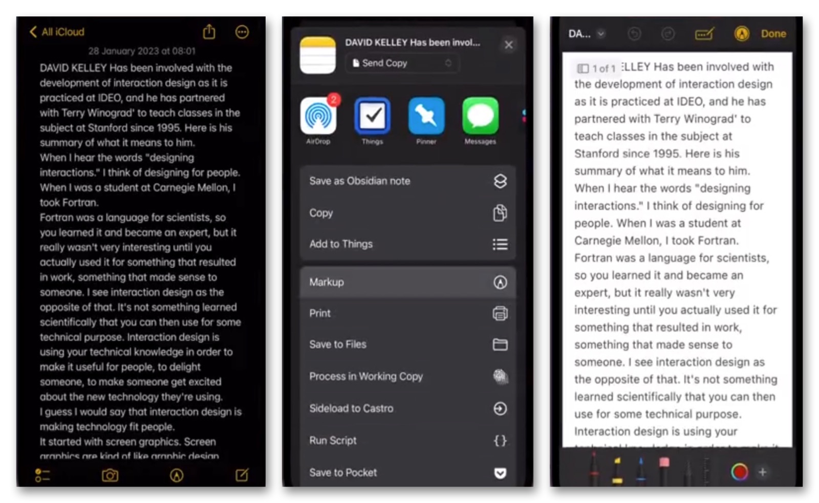 Si può ad esempio, sempre con la icona della fotocamera, inquadrare un documento ma anziché scattare una foto basta selezionare il testo e poi incollarlo all’interno della nota. A quel punto forse sarà necessario un po’ di editing per via degli accapo che non tornano mai, ma è certamente molto più veloce che non copiarlo a mano.