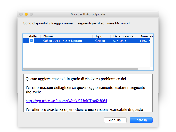 Microsoft ha rilasciato un update per Office 2011 che porta il pacchetto alla versione 14.5.6. La Casa di Redmond spiega che l’aggiornamento “è in grado di risolvere problemi critici” e in un documento di supporto più dettagliato che è stato risolto il problema che in alcuni casi bloccava l’applicazione Outlook con OS X 10.11 El Capitan.