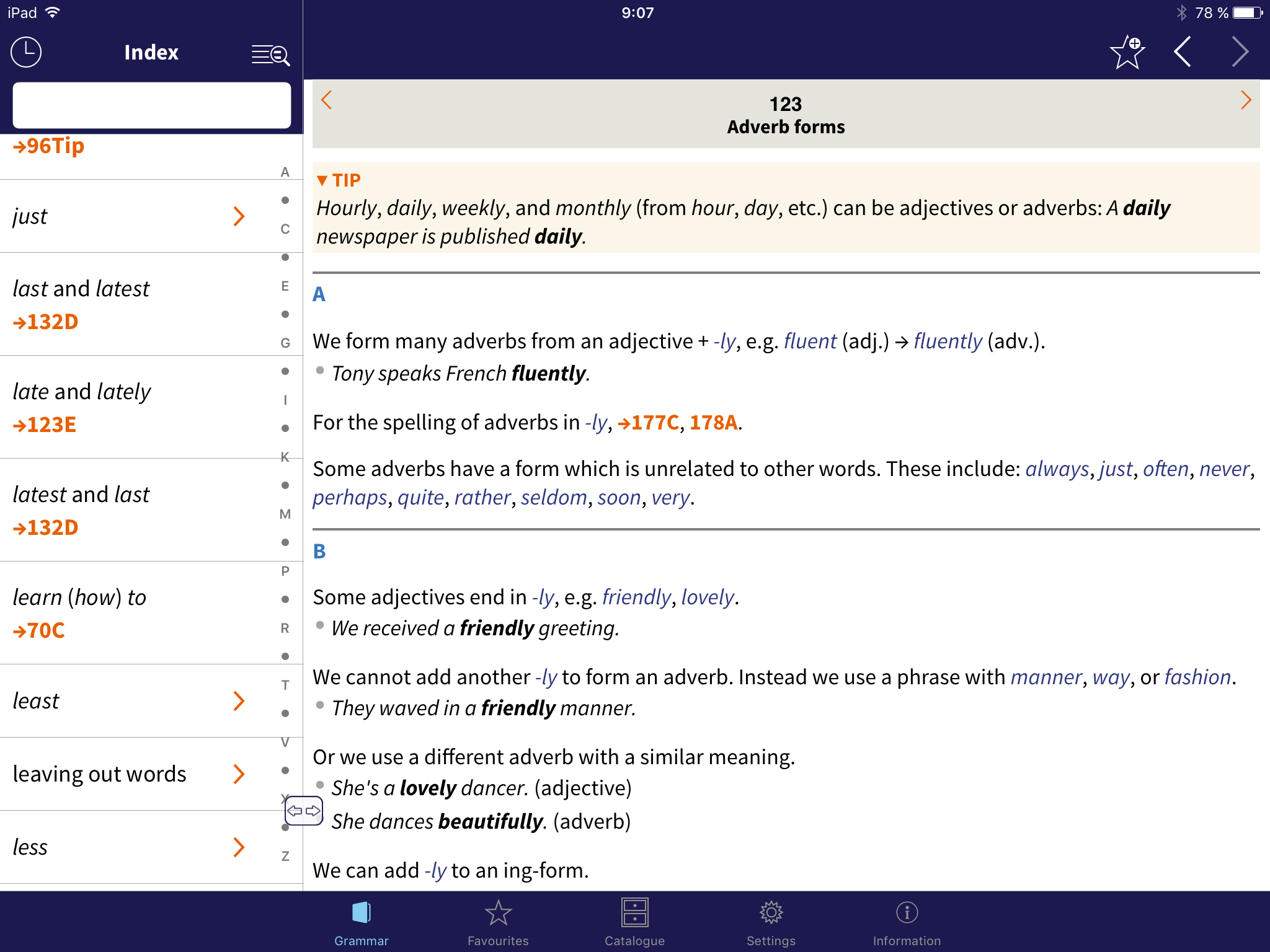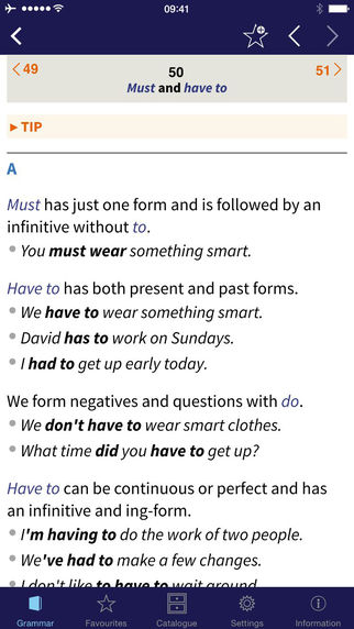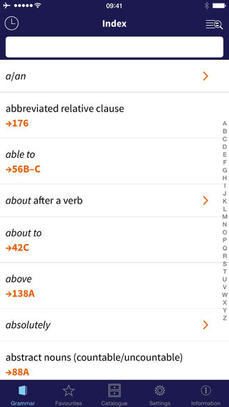 L’app Oxford Learner’s Quick Reference Grammar offre allo studente la possibilità di ripassare 181 argomenti di grammatica, di consultare circa 2mila esempi, riferimenti incrociati tra gli argomenti, 150 consigli utili per una pronuncia corretta e una dizione più naturale. La ricerca è il punto forte di questa applicazione: il database si può esplorare per temi grammaticali, attraverso l’indice dalla A alla Zeta, nelle liste di argomenti preferiti personalizzate dall’utente oppure visualizzando la cronologia che consente di avere sempre a portata le ricerche più recenti effettuate.
