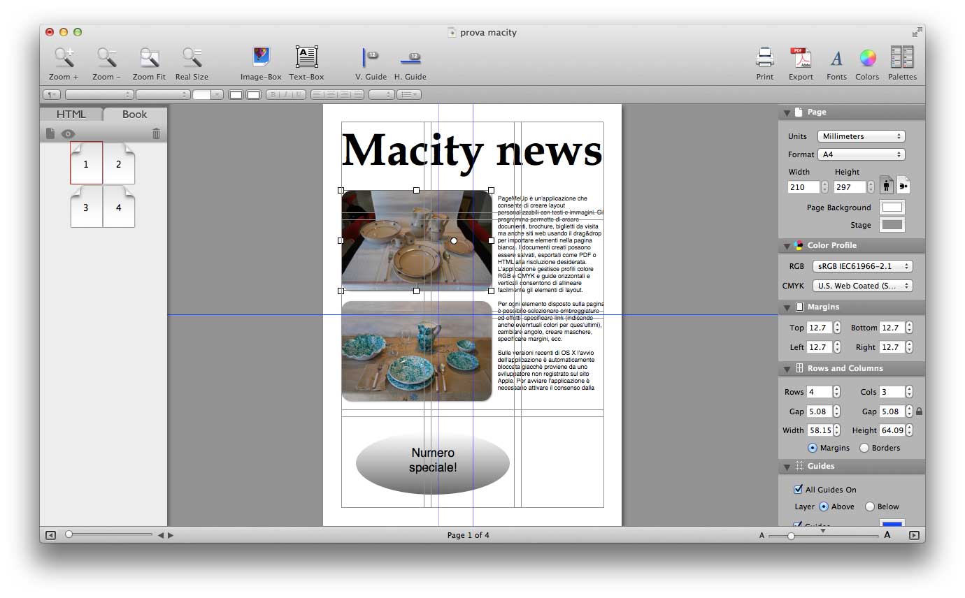 PageMeUp è un’applicazione che consente di creare layout personalizzabili con testi e immagini. Il programma permette di creare documenti multipagina, brochure, biglietti da visita ma anche siti web usando il drag&drop per importare elementi nella pagina bianca. I documenti creati possono essere salvati, esportati come PDF o HTML alla risoluzione desiderata. L’applicazione gestisce profili colore RGB e CMYK e guide orizzontali e verticali consentono di allineare facilmente gli elementi di layout.