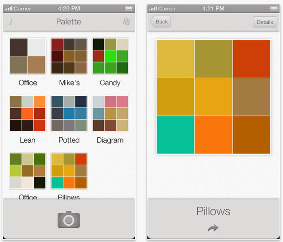 Palette è un’interessante applicazione per i dispositivi iOS che consente di generare una palette di colori partendo da un’immagine scattata con la fotocamere o presente nel rullino fotografico del proprio iDevice. Basterà scattare una foto (o sceglierla) per generare un’intera paletta dei colori che caratterizzano l’immagine, in base ad tre diverse visualizzazioni incluse nella app.