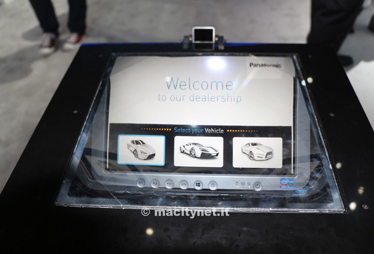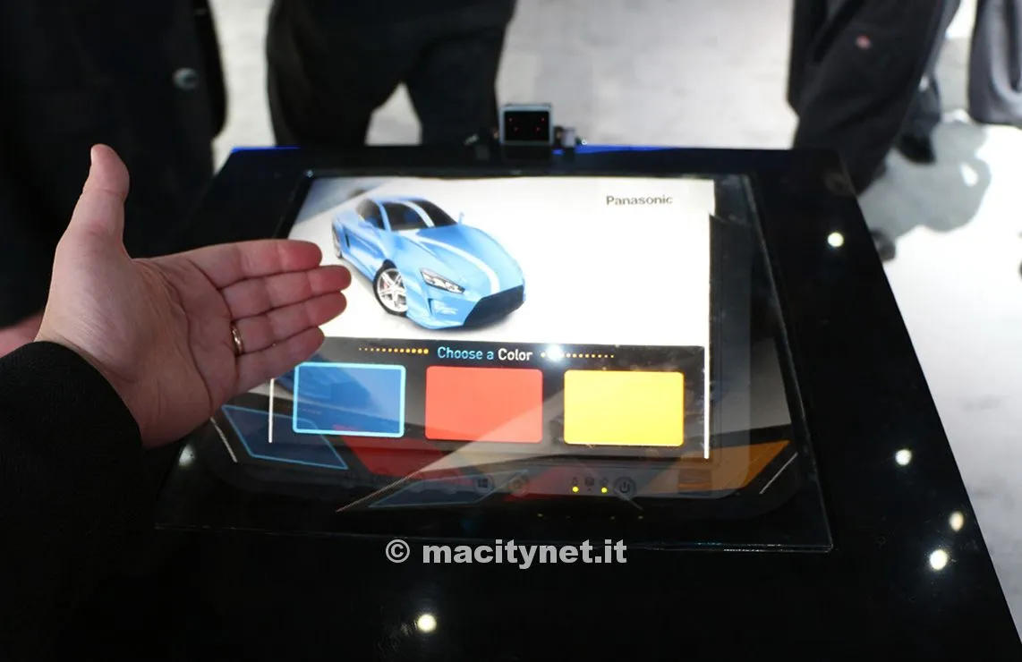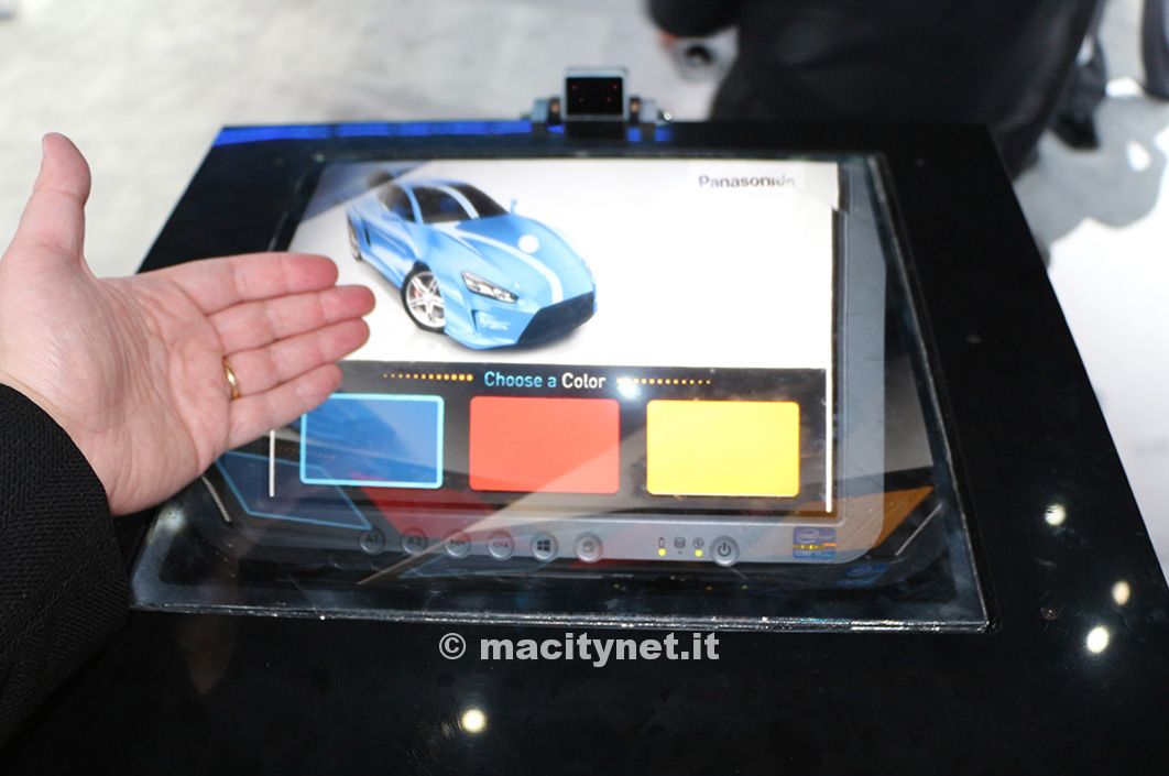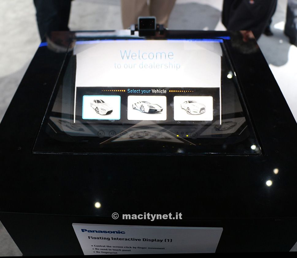 Il piccolo supporto posizionato all’altezza di un tavolo svelava una tecnologia che ci ha intrigato più di ogni altra di questo tipo che abbiamo visto al CES 2014 o in manifestazioni tecnologiche: si tratta di Panasonic Floating Display interattivo, di fatto uno schermo galleggiante che combina intelligentemente oltre alle consuete tecnologie olografiche a cui siamo abituati anche la possibilità di interagire con l’oggetto proiettato con il vantaggio che anche dopo l’uso di migliaia di clienti lo schermo (che non c’è) rimarrà sempre pulito.