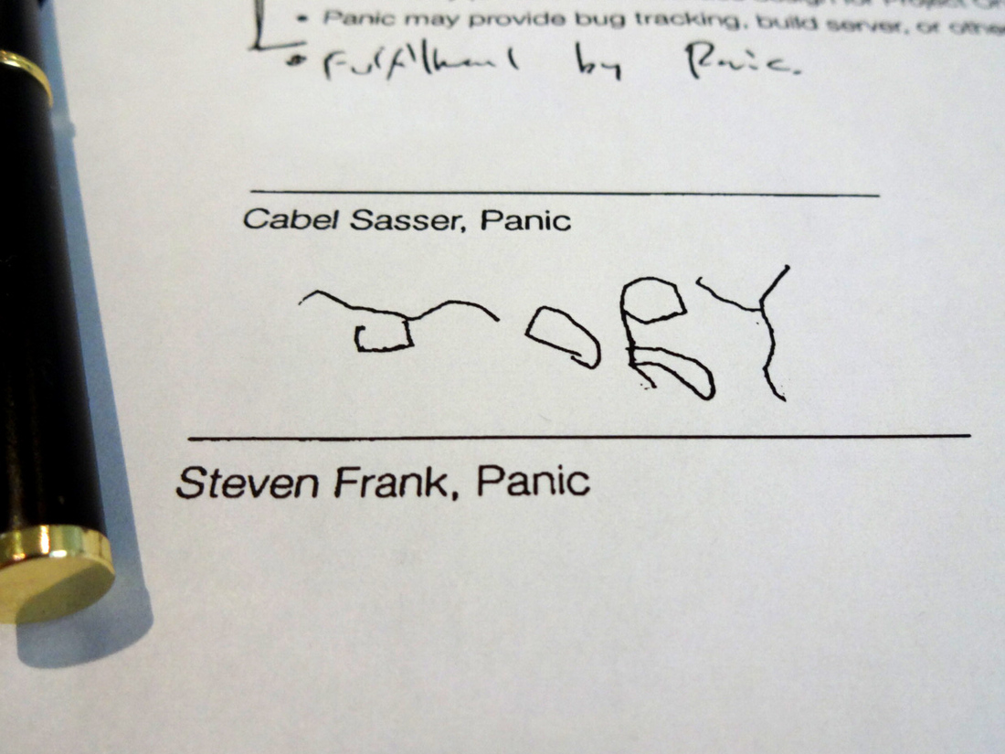 Una settimana prima dell’annuncio ufficiale, i soci di Campo Santo sono arrivati nella sede di Panic a Portland (Oregon) e si sono seduti intorno a un tavolo nella sala riunioni della società per firmare il contratto. Come si vede nella foto in calce, anche il figlio, ancora bambino, di Sasser era presente all’incontro e, in un momento di distrazione di tutti, ha voluto anche lui apporre la sua firma sul contratto.