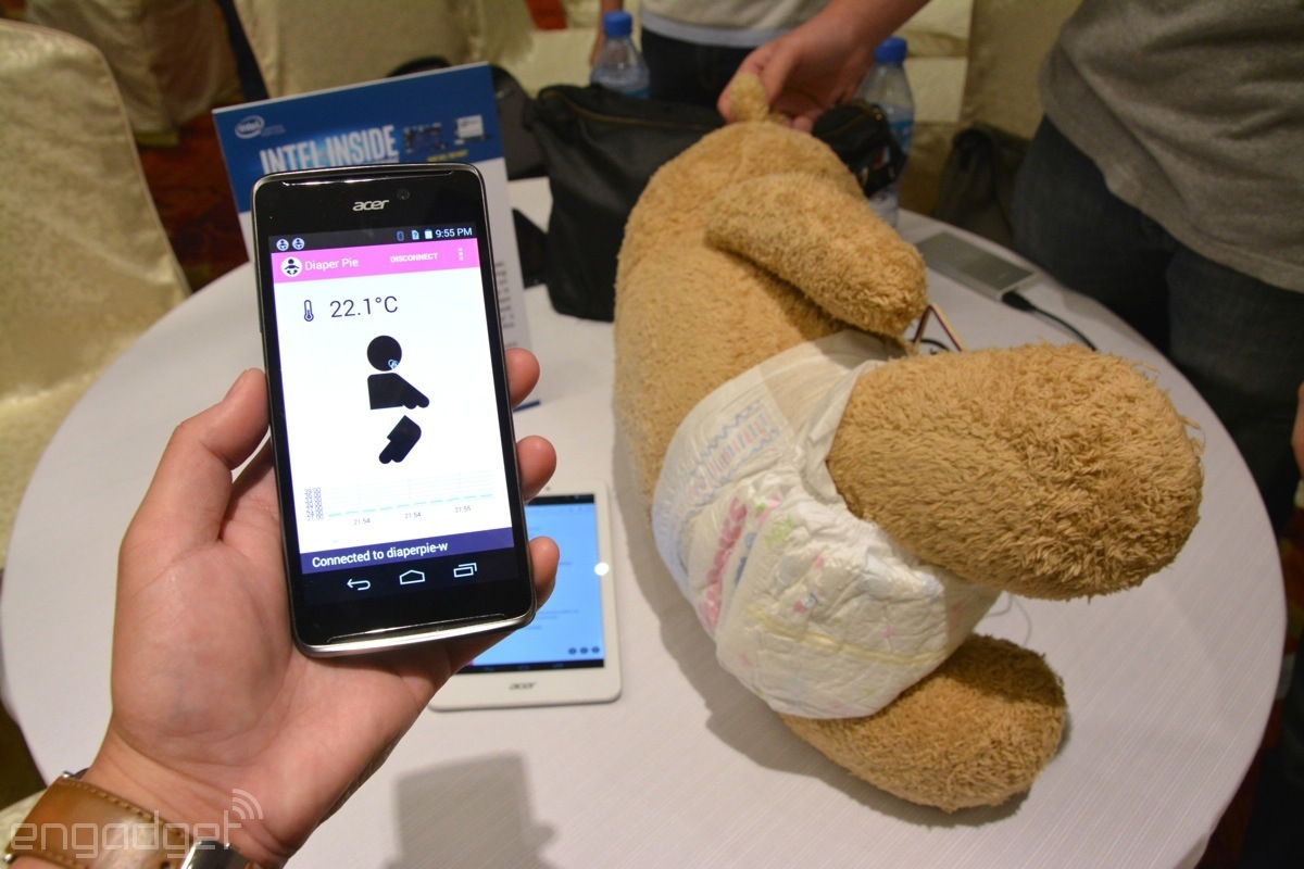 La stazione miniaturizzata, in grado di trasformare il pannolino in un indossabile smart, prende il nome di DiaperPie, creato da quattro ingegneri Acer. Il modulo, sempre che troverà spazio sul mercato, dato che ancora non è stato commercializzato, ha attualmente le dimensioni di una monetina e grazie alla tecnologia bluetooth a basso consumo è in grado di restituire ai genitori, importanti informazioni sul piccolo bebè che lo indossa.
