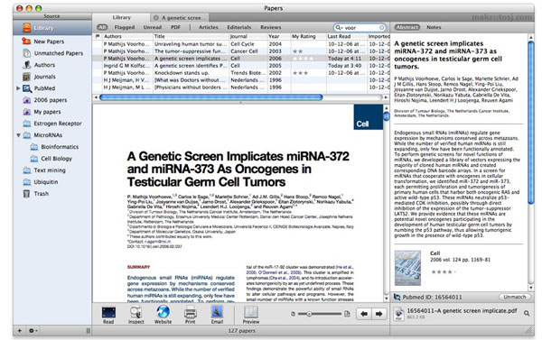 Mekentosj (notare l’assonanza con ‘Macintosh’), lancia un programma dedicato a chi ha interessi scientifici, soprattutto legati a testi tecnici. Il programma si chiama Papers e si preoccuperà di gestire i vostri “papers” scientifici in PDF, memorizzandoli e/o organizzandoli sul vostro Mac. L’interfaccia ricorda una commistione fra iTunes e iPhoto, aspetto che faciliterà la comprensione delle funzioni disponibili.