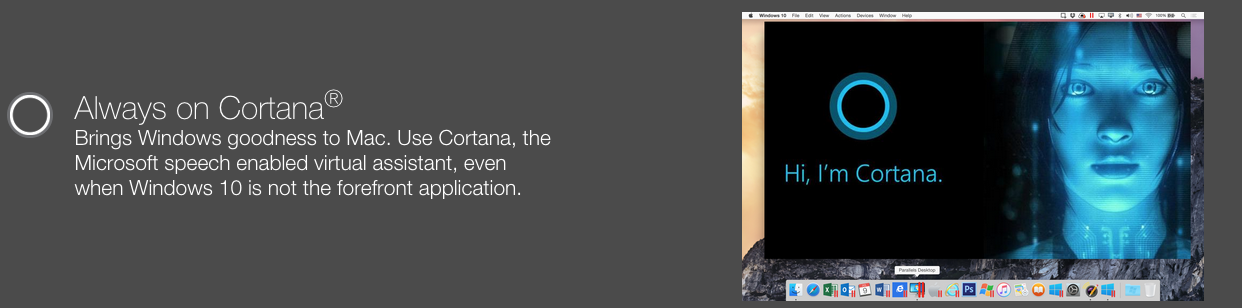 Parallels sta preparando la nuova versione del virtualizzatore Parallels Desktop. Non conosciamo ancora i dettagli della nuova release ma sul sito degli sviluppatori del software è apparsa brevemente una pagina (ora rimossa) con la descrizione di una delle novità: la possibilità di sfruttare Cortana, l’assistente personale digitale di Windows 10, direttamente dal Mac. In pratica l’assistente vocale sarà sfruttabile anche se la finestra con Windows 10 non è selezionata come applicazione principale, permettendo di ottenere suggerimenti, offrire promemoria e offrire accesso a varie informazioni attraverso comandi testuali o vocali.